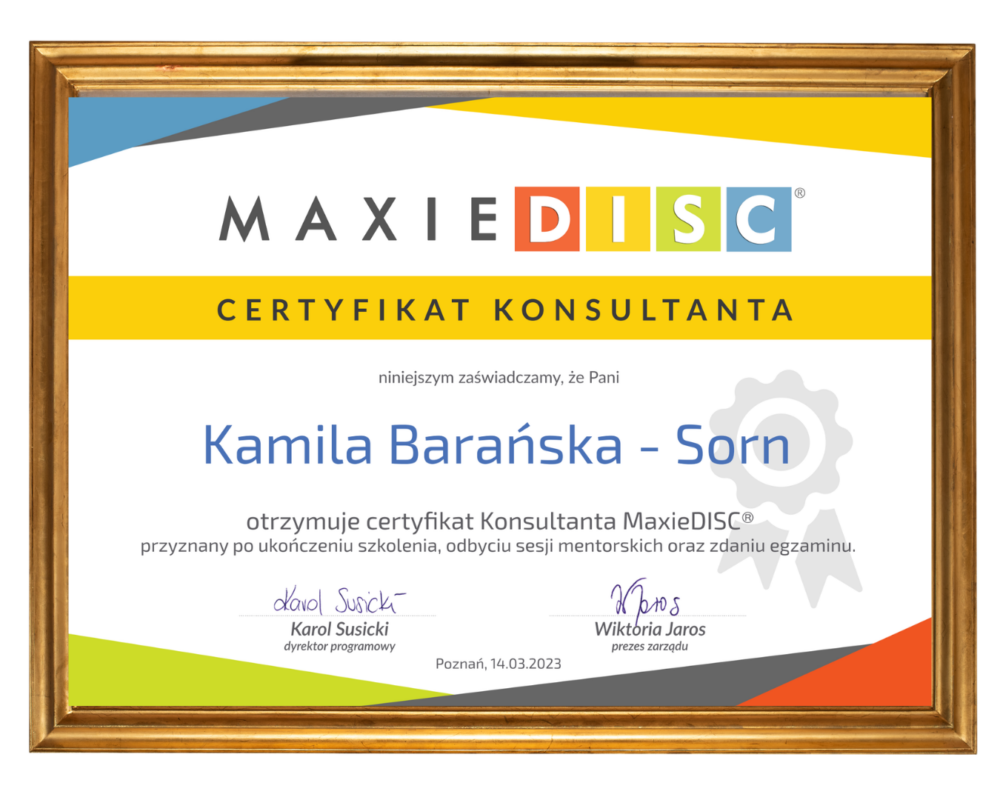 Trenerka kompetencji miękkich, certyfikowana konsultantka maxieDISC®️